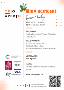 Ve čtvrtek 11. prosince zazněl v brněnské vile Löw-Beer čtvrtý koncert z cyklu Malé koncerty komorní hudby. Měl rekordní návštěvnost, přítomni byli skladatelé premiér včetně Ľubicy Čekovské, která dorazila ze Slovenska. Zahráli jsme premiéru jejího díla Ornithic Tales. Druhou premiérou večera byla skladba Rumination brněnského skladatele Tomáše Pelouška. Adventní náladu podpořilo nejen cukroví, ale také Goldbergovy variace Johanna Sebastiana Bacha v úpravě Václava Vonáška a Vánoční suita Evžena Zámečníka. Studentky Klára a Terezie Graffovy zahrály virtuozní houslové duo Bohuslava Martinů.